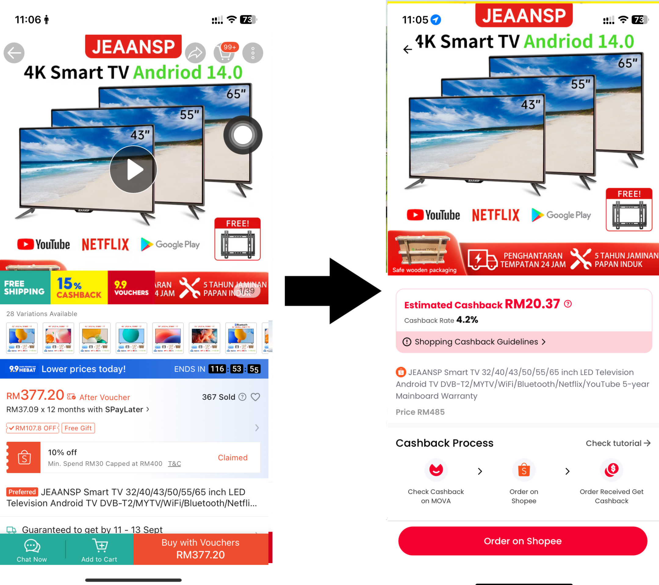 Bahagian paling menyeronokkan dalam MOVA ialah membeli-belah seperti biasa tetapi setiap kali, duit anda "beranak". Proses membeli amat mudah: buka aplikasi, pilih kedai atau produk yang anda mahu, buat pesanan, dan bayar seperti biasa. Bezanya, selepas pembayaran selesai, anda akan nampak jumlah cashback dikira secara automatik.
